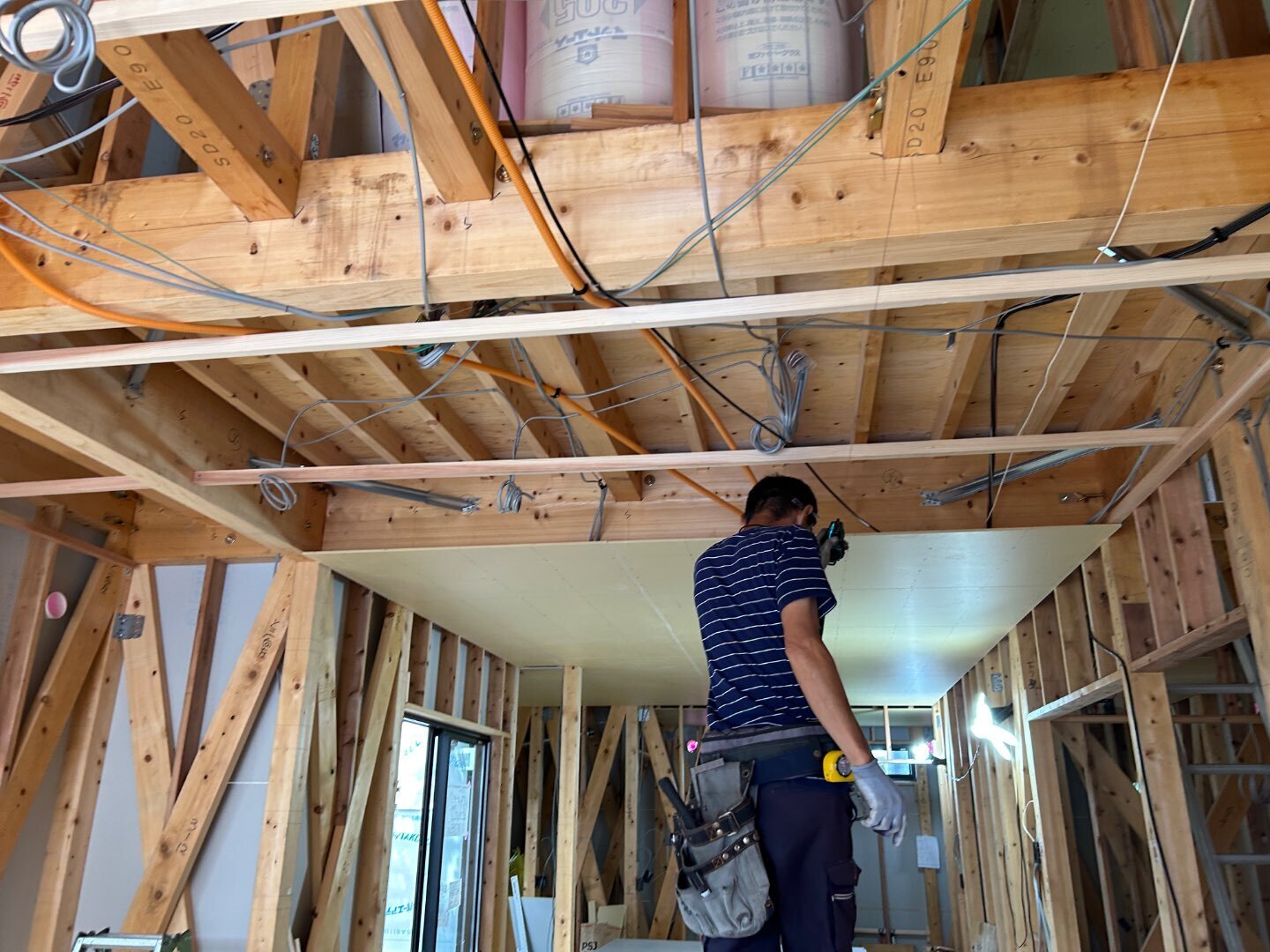 大工さんによる天井にプラスターボードを貼り付ける下地の設置がおこなわれています。
