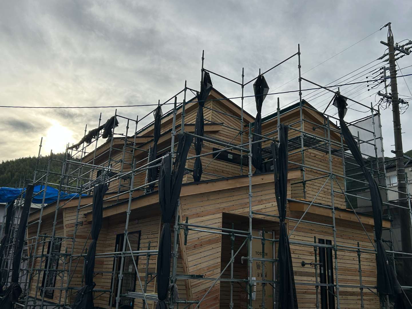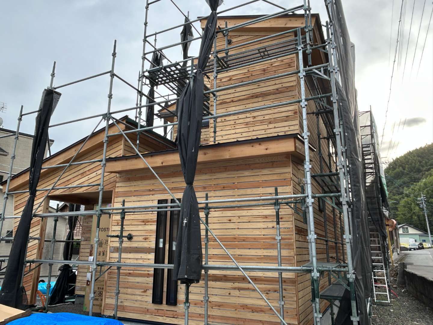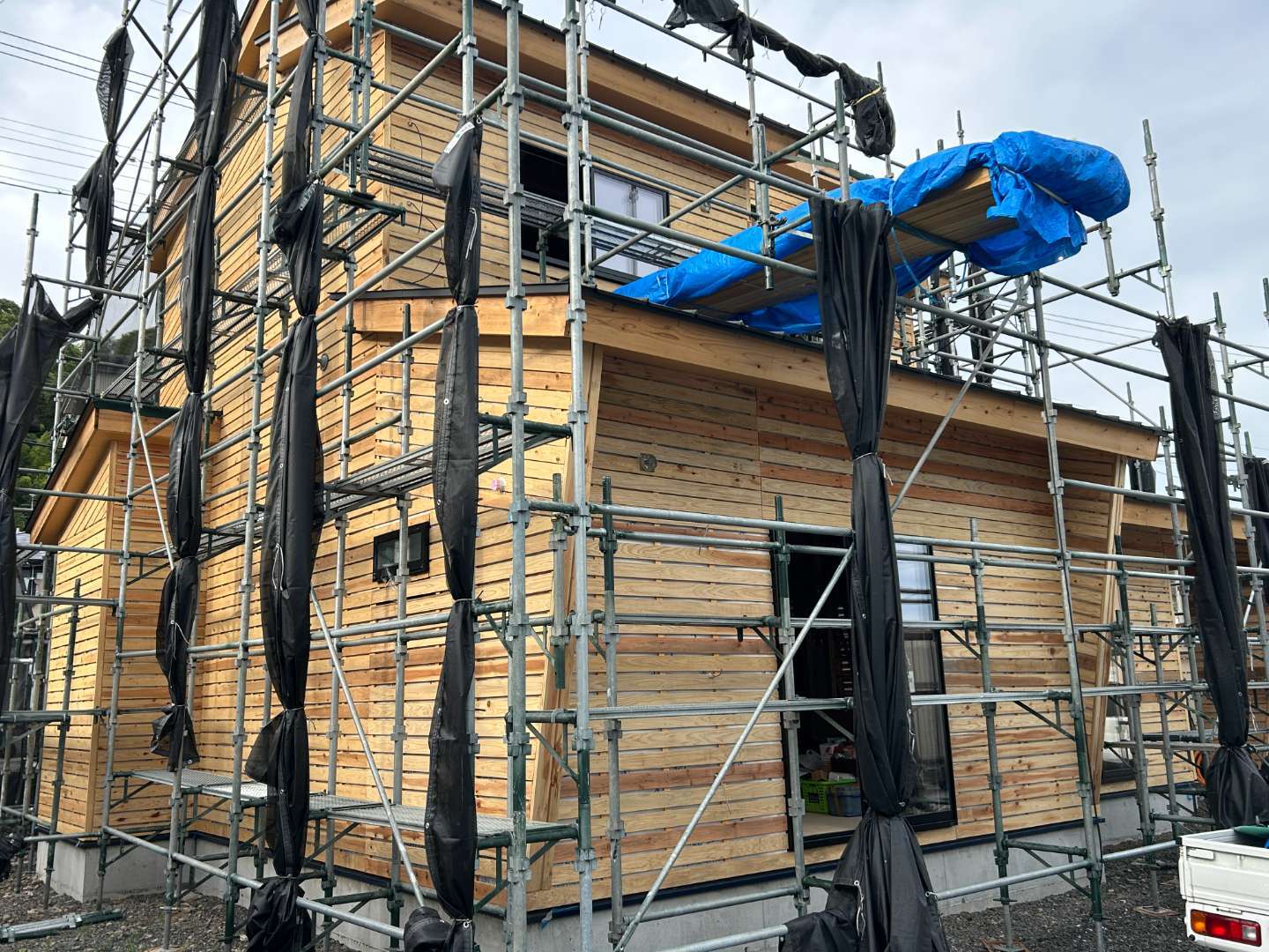 外壁をモルタルで仕上げるときに、無垢の木材を張り付けて、防水フェルト紙やモルタルが塗りやすいように全面木材を張り付けます。